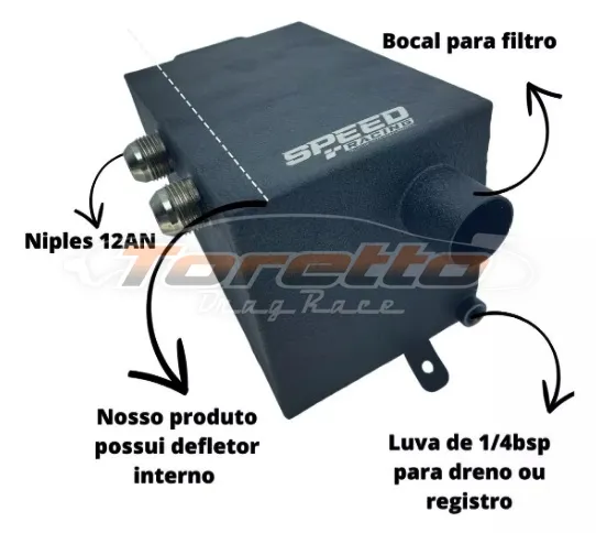 O reservatório de óleo para linha VW G1 tem como função o respiro do motor e a coleta de resíduos de óleo expelidos pelo motor. Possui fácil instalação e não necessita de adaptação, pois vai fixado no suporte original do reservatório de agua do limpador de parabrisas, reservatório possui duas entradas com niple para uso de conexão no padrão 12AN ou com espigão para uso de mangueira e abraçadeira (selecionar o modelo desejado no campo de variação do produto) e uma luva de 1/4bsp na parte inferior para uso de dreno ou registro.